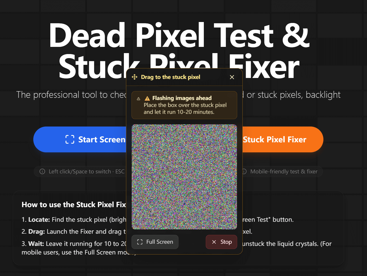 - Launch the tool: Click "Launch Stuck Pixel Fixer" on our Dead Pixel Test page.